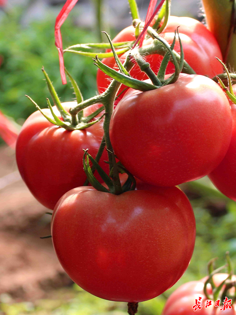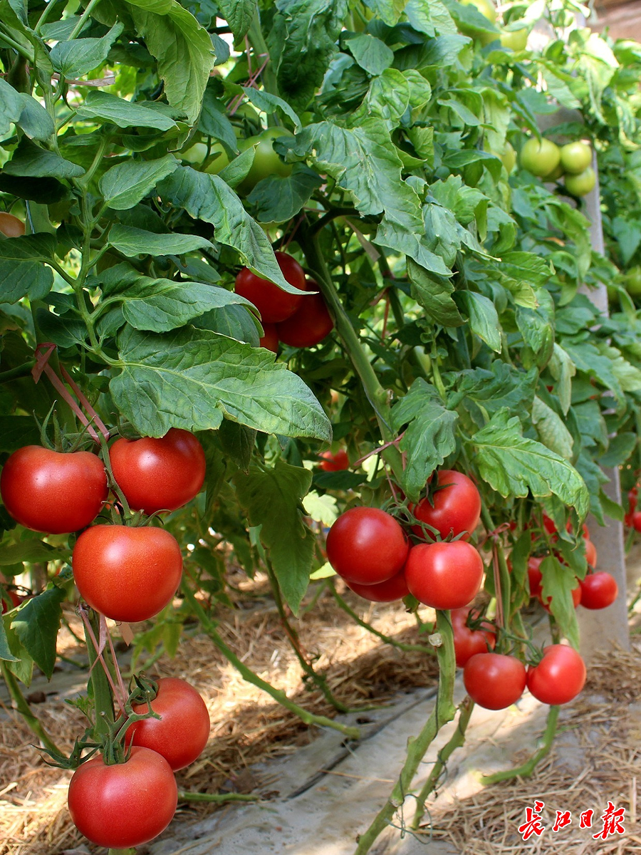 6月3日,楚为汉南科研基地番茄园,即将进入盛果期,红艳艳的番茄夹杂在青红色、青绿色的番茄之间,煞是可爱。