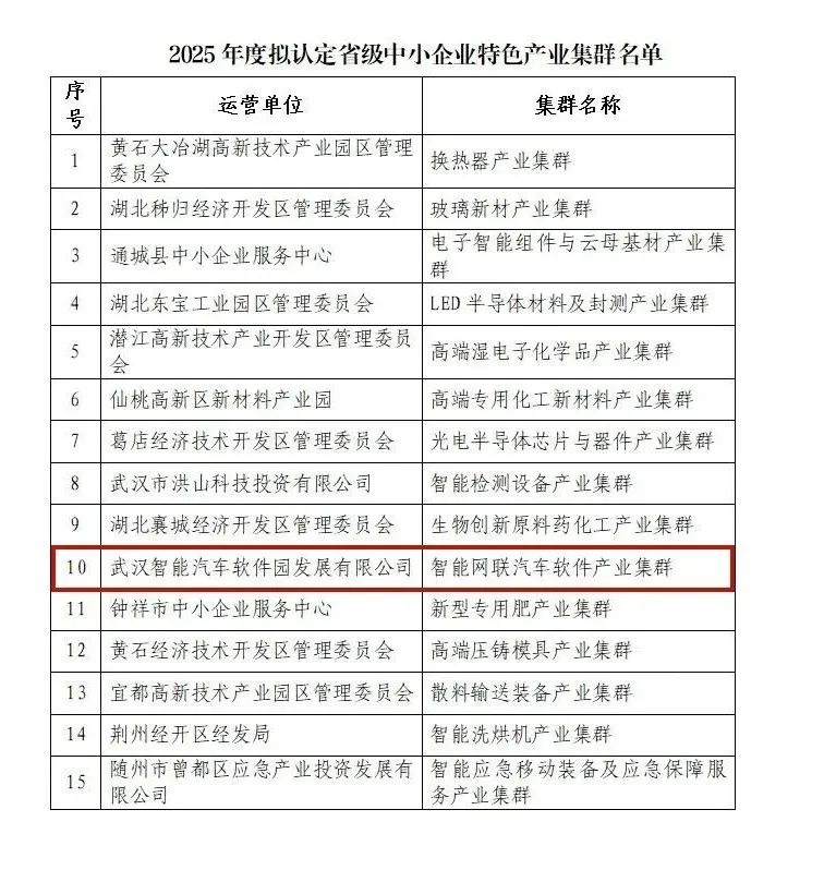 近日,湖北省经信厅公示2025年度省级中小企业特色产业集群名单。武汉经开区智能网联汽车软件产业集群入选,是武汉市上榜的2家产业集群之一。