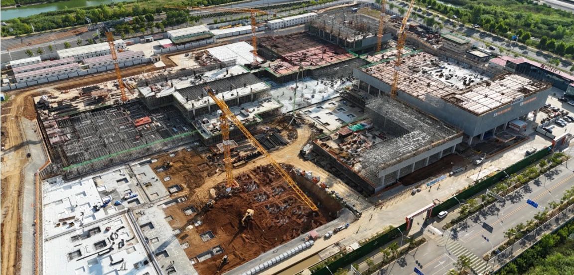 陈智介绍,项目启动以来,建设团队创造了“30天完成2156根桩基、38万立方米土方作业,高峰期单日892车次土方运输量、每小时浇筑167立方米结构混凝土”的施工纪录。目前,项目已完成展示中心C区主体结构、展示中心B区3层结构及主楼层主体结构等施工任务,向着2026年春节前完成主楼结构封顶等节点目标发起冲刺。