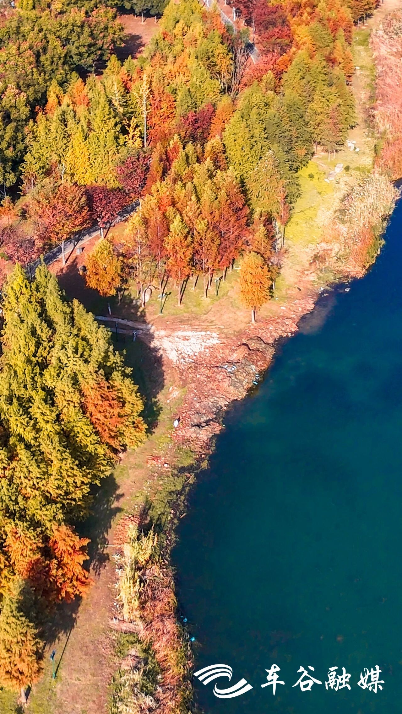 蓝色湖心逐渐晕开岸边的“橙黄橘绿”