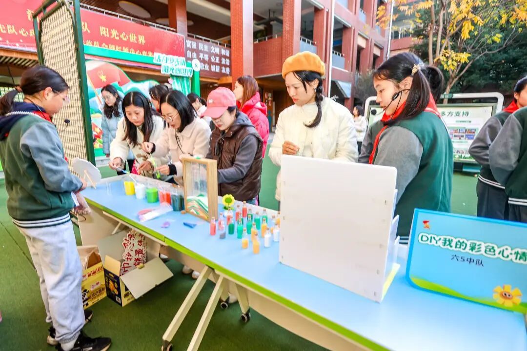 “这是我们中队绘制的情绪能量瓶,每个瓶子都代表着我们内心说不出来的小情绪。这是一种心灵解压的好方法哦,同学们也可以试试绘制看看!”另一个摊位上的少先队员兴奋地推介着自己中队的创作成果。