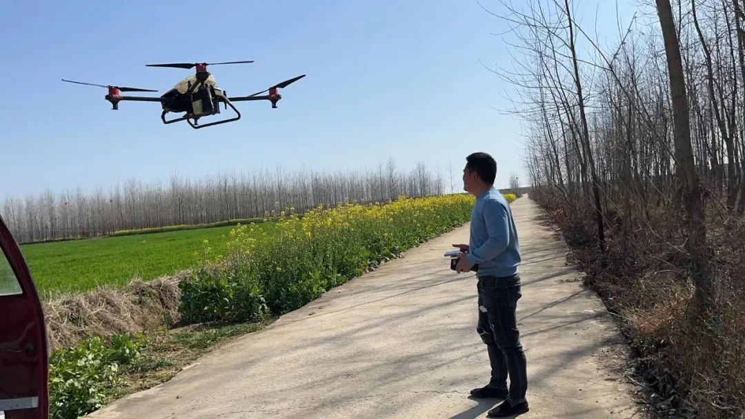 3月8日下午3点半,新洲区辛冲街周家墩农民王汉华和王兴承包的1300多亩农田里,95匹马力的雷沃拖拉机正拉着铁犁旋耕土地,农民王兴正在操作大疆重型农业无人机喷洒药水。这片高标准农田去年刚刚完成建设,修建了灌溉排水沟渠,硬化了道路,还对土壤进行了有机质提升。