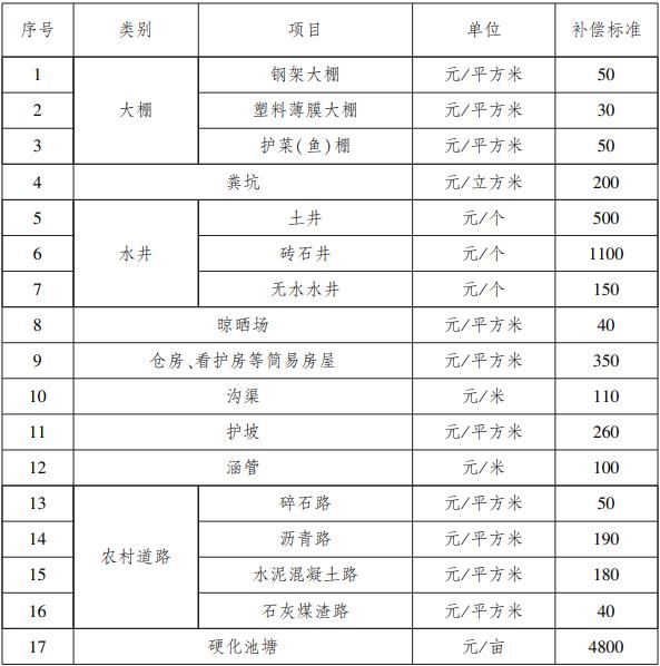 注:1.温室大棚等补偿标准可在此基础上适当提高;
