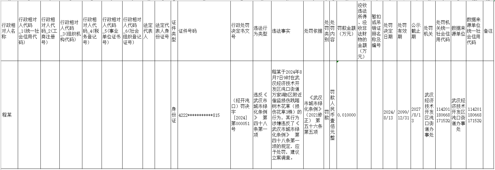 对违反《武汉市城市绿化条例》的处罚(程某)
