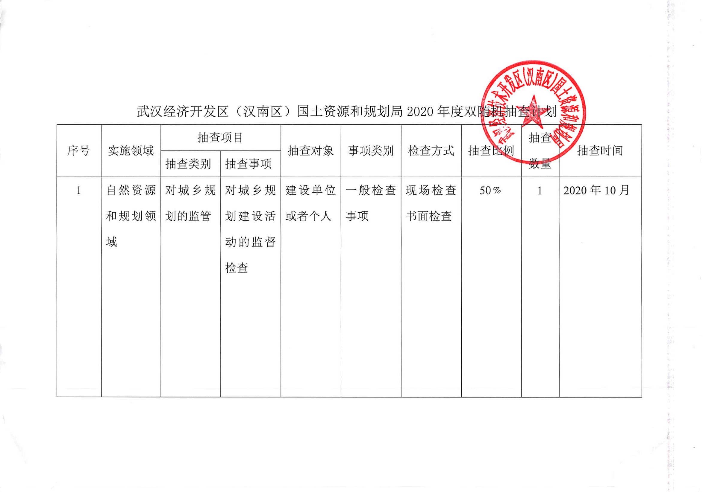 武汉经开区(汉南区)自然资源和规划局2020年双随机抽查计划