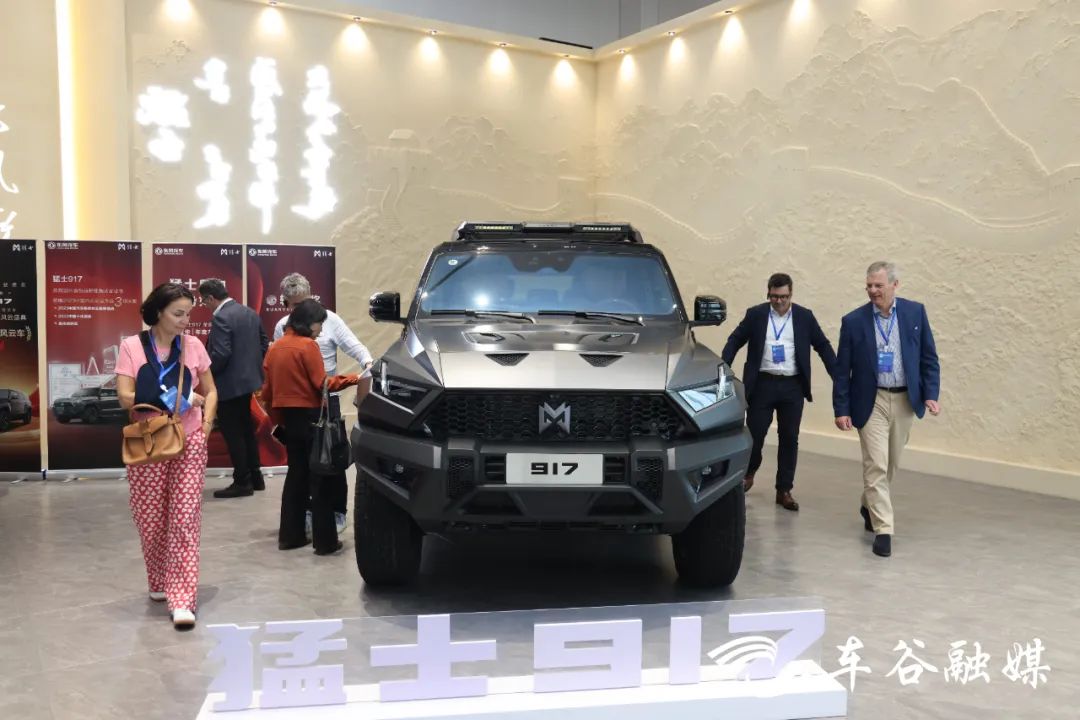 在猛士科技园区的越野体验公园,静态展示的猛士917,狮吼式前脸、十字标靶前大灯、黑色亚光车身,让他们眼前一亮。在动态演示中,猛士917爬上接近45º的徒坡,驶过坑坑洼洼的石子路,涉过水深90厘米的深坑,其强悍的越野能力和通过性能,引来一片惊叹。