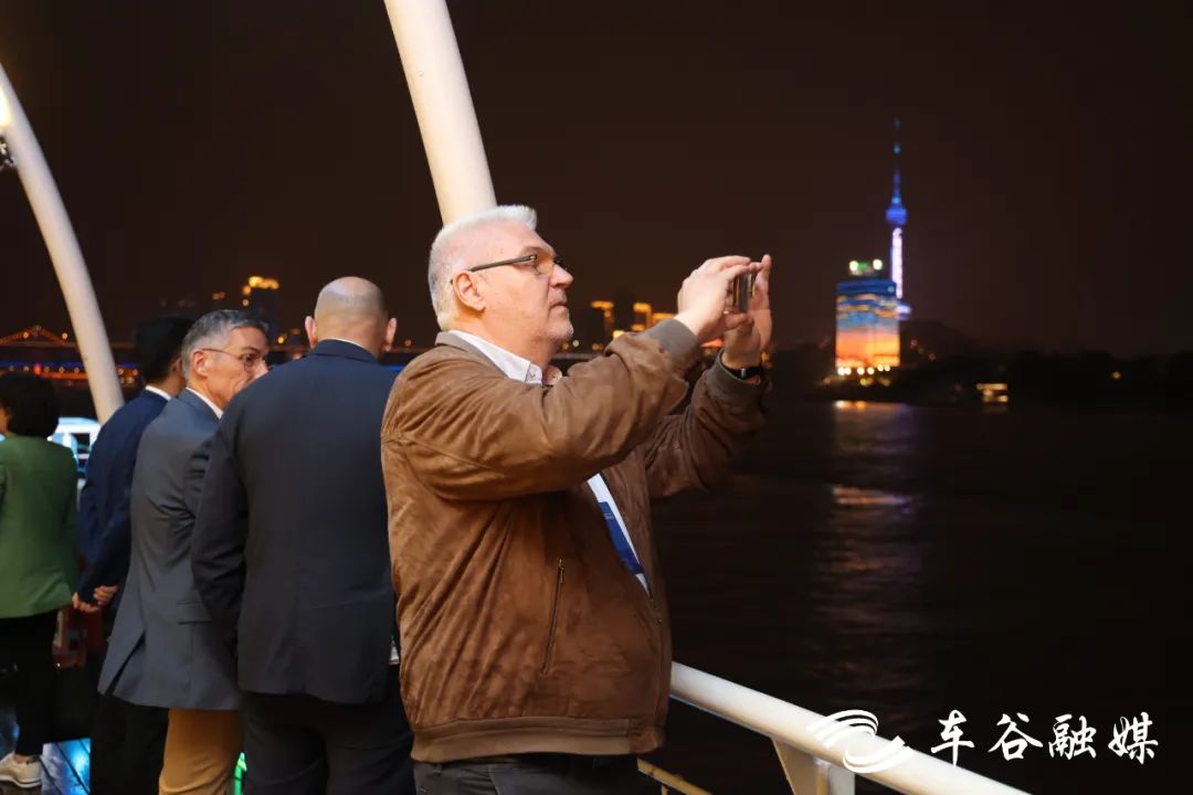汉口江滩王家巷码头迎来了参加2024中外企业家车谷论坛的百余名中外企业家及嘉宾。从塞纳河畔到长江之滨,来自法国的嘉宾登上“船长9号”游轮,沿江溯流而上,沉浸式感受江城夜色,共话合作新机遇。