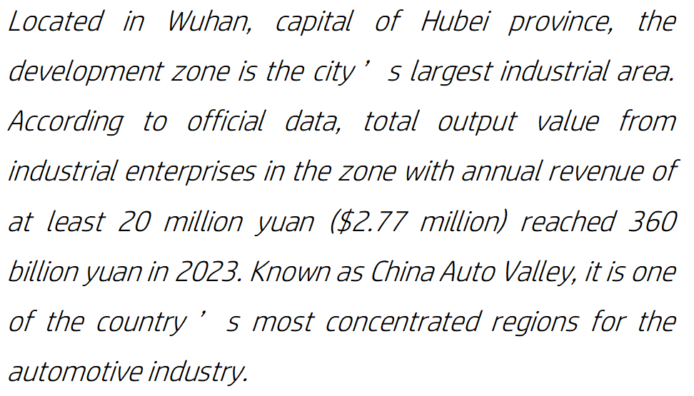 武汉经开区位于湖北省省会武汉,是该市最大的工业区域,是全国汽车产业最集中的地区之一,被誉为“中国车谷”。据官方数据,2023年,年收入至少2亿元人民币的工业企业在该区的总产值达到了3600亿元人民币。