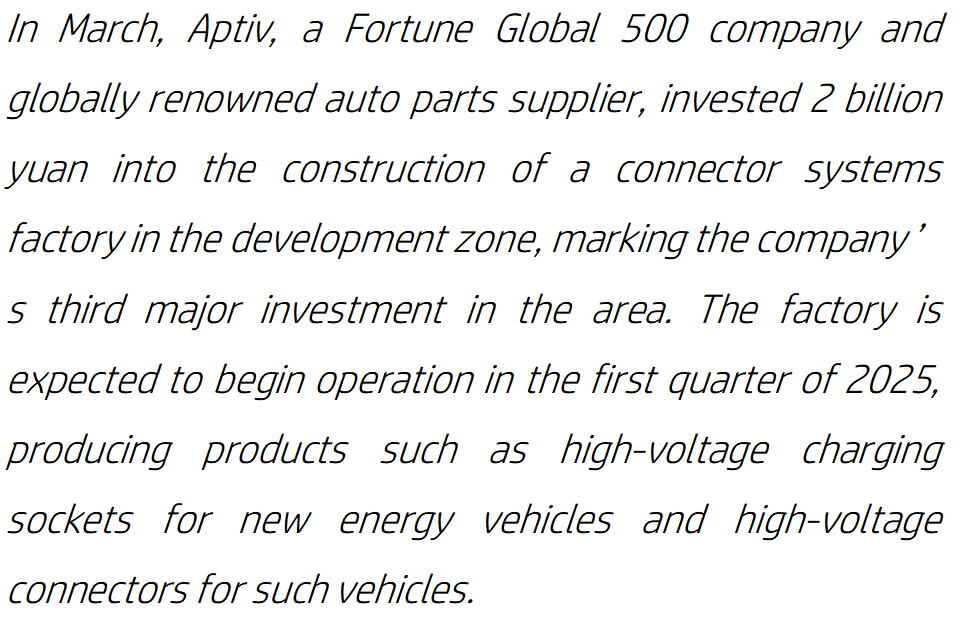 今年三月,全球500强企业、全球知名汽车零部件供应商安波福(Aptiv)在武汉经开区投资20亿元人民币建设一个连接器系统工厂。这是该公司在武汉经开区的第三个重大投资项目,生产新能源汽车高压充电插座和高压连接器等产品。该工厂将于2025年第一季度开始运营。