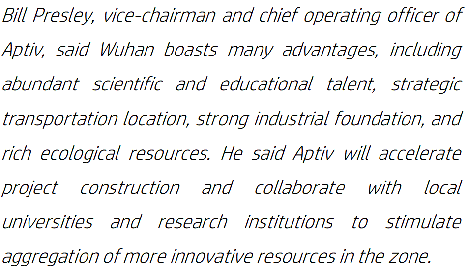 安波福副主席兼首席运营官比尔·普雷斯利(Bill Presley)表示,武汉拥有许多优势,包括丰富的科学和教育人才、战略交通位置、强大的工业基础和丰富的生态资源。他表示,安波福将加快项目建设,并与当地大学和研究机构合作,激发该区更多创新资源的聚集。