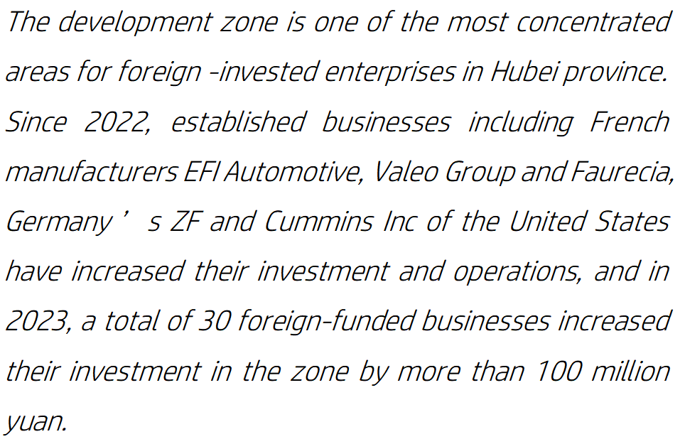 武汉经开区是湖北省外资企业最集中的地区之一。自2022年以来,包括法国制造商EFI Automotive、法雷奥集团、佛瑞亚,德国的采埃孚ZF、美国的康明斯公司在内的企业增加投资、拓展业务。2023年,共有30家外资企业在武汉经开区增加投资。