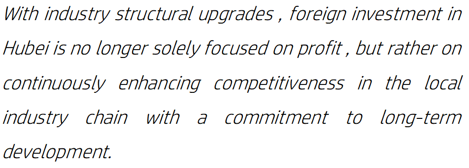 随着产业结构升级,湖北的外资投资不再仅仅只关注利润,而是致力于不断提升本地产业链的竞争力,致力于长期发展。