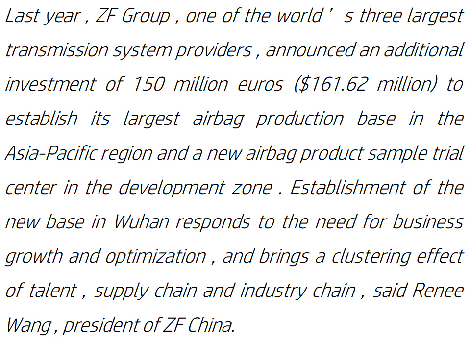 去年,全球三大传动系统供应商之一的ZF集团宣布额外投资1.5亿欧元,在武汉经开区建立其在亚太地区最大的气囊生产基地和一个新的气囊产品样品试验中心。ZF中国总裁王润怡(Renee Wang)表示,在武汉建立新基地响应了业务增长和优化的需求,并带来了人才、供应链和产业链的聚集效应。