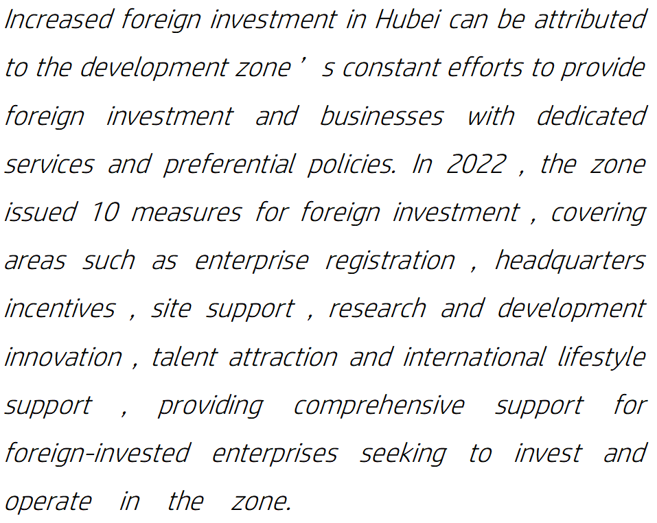 武汉经开区不断优化营商环境,出台优惠政策,为外商投资和外资企业高质量发展保驾护航。2022年,武汉经开发布了“外资十条”举措,涵盖企业注册、总部激励、场地支持、研发创新、人才吸引和国际生活方式支持等领域,为寻求在武汉经开区投资和运营的外资企业提供全面支持。