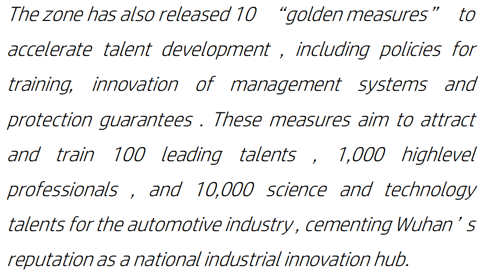 同时,武汉经开区还发布了“黄金十条”加速人才发展,包括培训政策、管理系统创新和保护保障等。这些措施旨在吸引和培养100名领军人才、1000名高层专业人才和1万名汽车行业的科技人才,助推武汉建设具有全国影响力的科技创新中心。