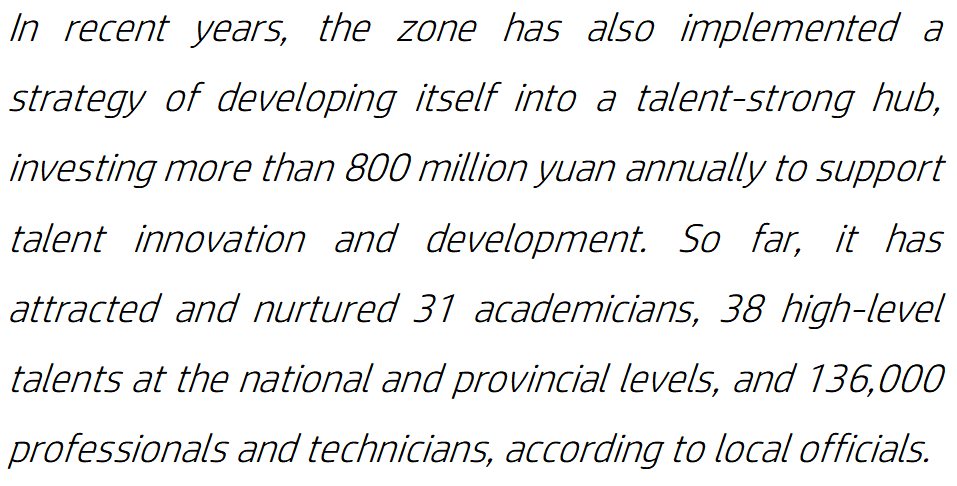 近年来,武汉经开区还实施“人才强区战略”,每年投入超过8亿元人民币支持人才创新和发展。据当地政府相关人士介绍,迄今为止,该区已吸引和培养了31位院士、38位国家和省级高层人才以及13.6万名专业技术人才。