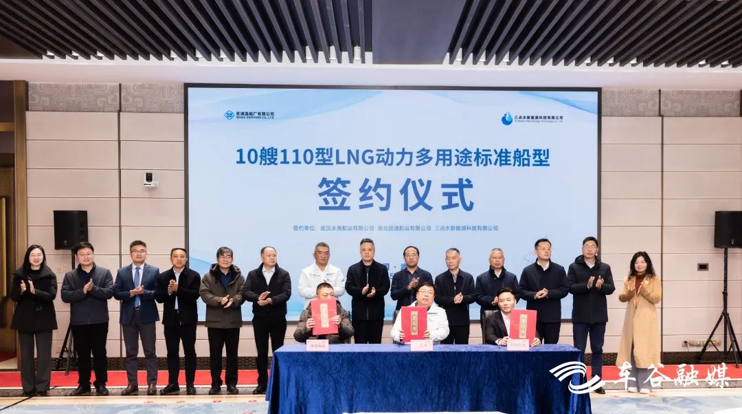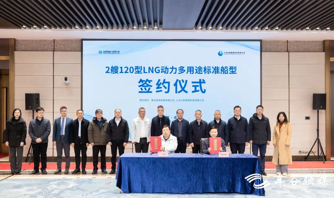 揭牌当天,三点水新能源华中区域总部迎来“开门红”。三点水新能源湖北公司与武汉永亮航运、湖北国通航运签署10艘110型LNG(液化天然气)动力多用途标准船型建造协议,与湖北德来轮船签署2艘120型LNG(液化天然气)动力多用途标准船型建造协议,签约总额超亿元。