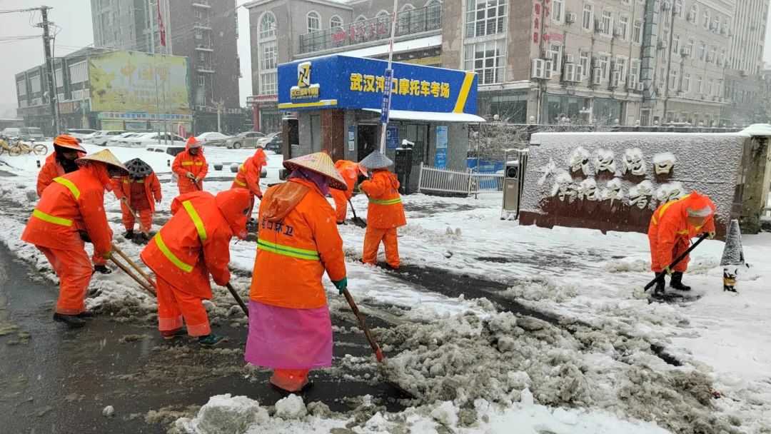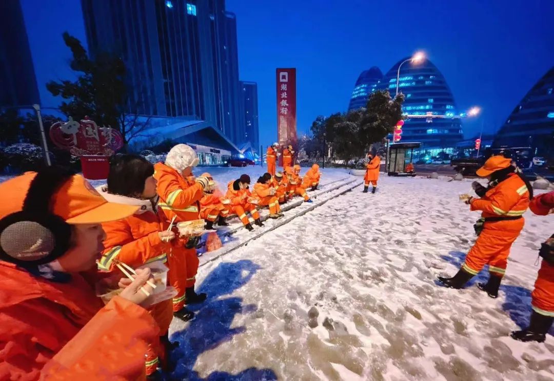 当天,武汉迎来强降雪,武汉经开区环卫工作人员顶着雪花、冒着严寒,昼夜奋战,从凌晨忙到日暮,十几个小时坚守在风雪中,奋战在清除积雪的街头。那雪天里的一抹抹“橘红”,也成为城市里一道亮丽的风景线。