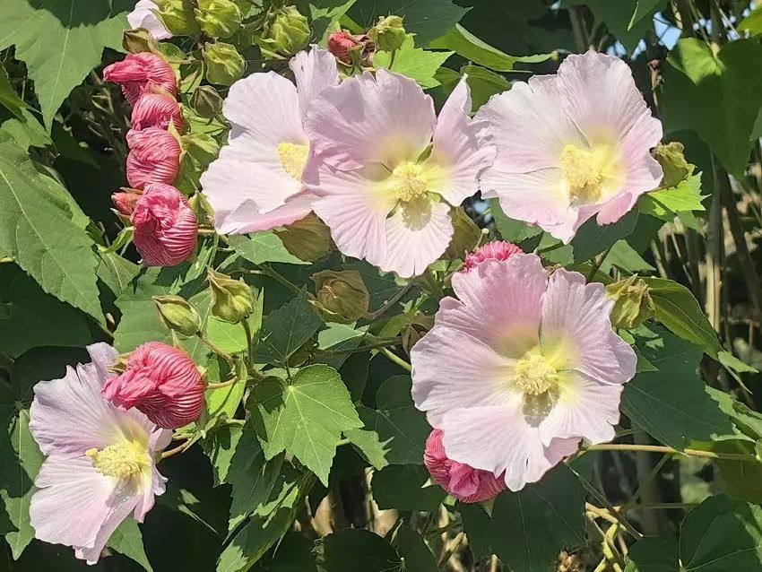 木芙蓉有重瓣者,叫醉酒芙蓉,花色一日三变,清晨初开时是洁白或淡红,午后转为粉红色,傍晚花朵快闭合时,颜色呈深红色。古人称木芙蓉为“酒醉芙蓉”或者“三醉花”,意指芙蓉花如醉酒佳人的面庞一般美丽。这样的特征其实是因花瓣含有花青素,花青素的浓度和酸碱度会随着温度变化而变化。