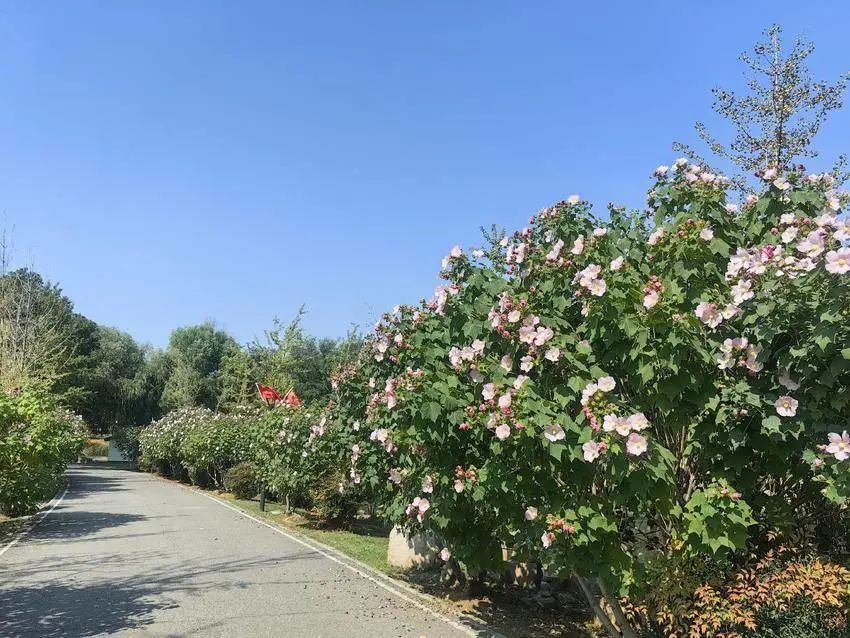 近期,武汉经开区汤湖公园内的木芙蓉、硫华菊、波斯菊盛开,伴着公园国庆期间摆放的一串红、鸡冠花、孔雀草、彩叶草等时令草花,以及沿路的五星红旗迎风飘扬,熠熠生辉,光彩照人。公园内一片片已经开始被秋霜染红或染黄了的乌桕、枫香、银杏、栾树在向人们传达着阵阵秋意。