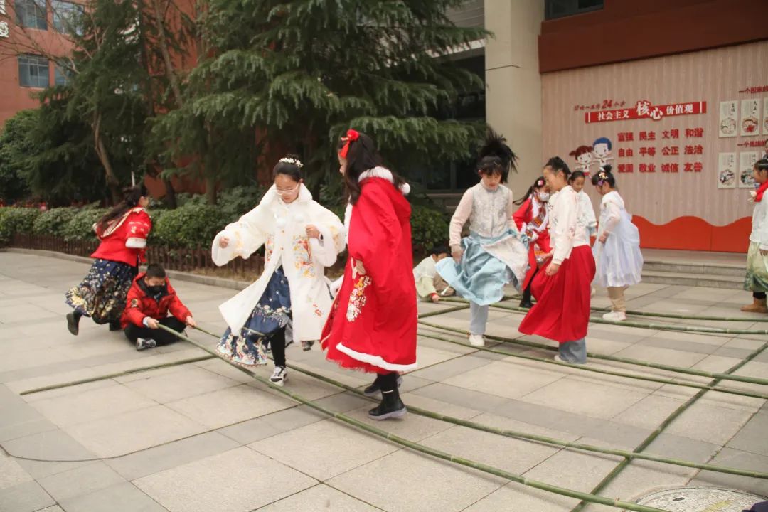在武汉经开区实验小学“元宵喜乐汇 文化共传承”活动现场,孩子们穿起汉服,在校园里赏花灯、猜谜语、玩游戏、舞龙舞狮,体验非遗民俗项目,在传承中华传统文化的同时,迎接新学期的到来。
