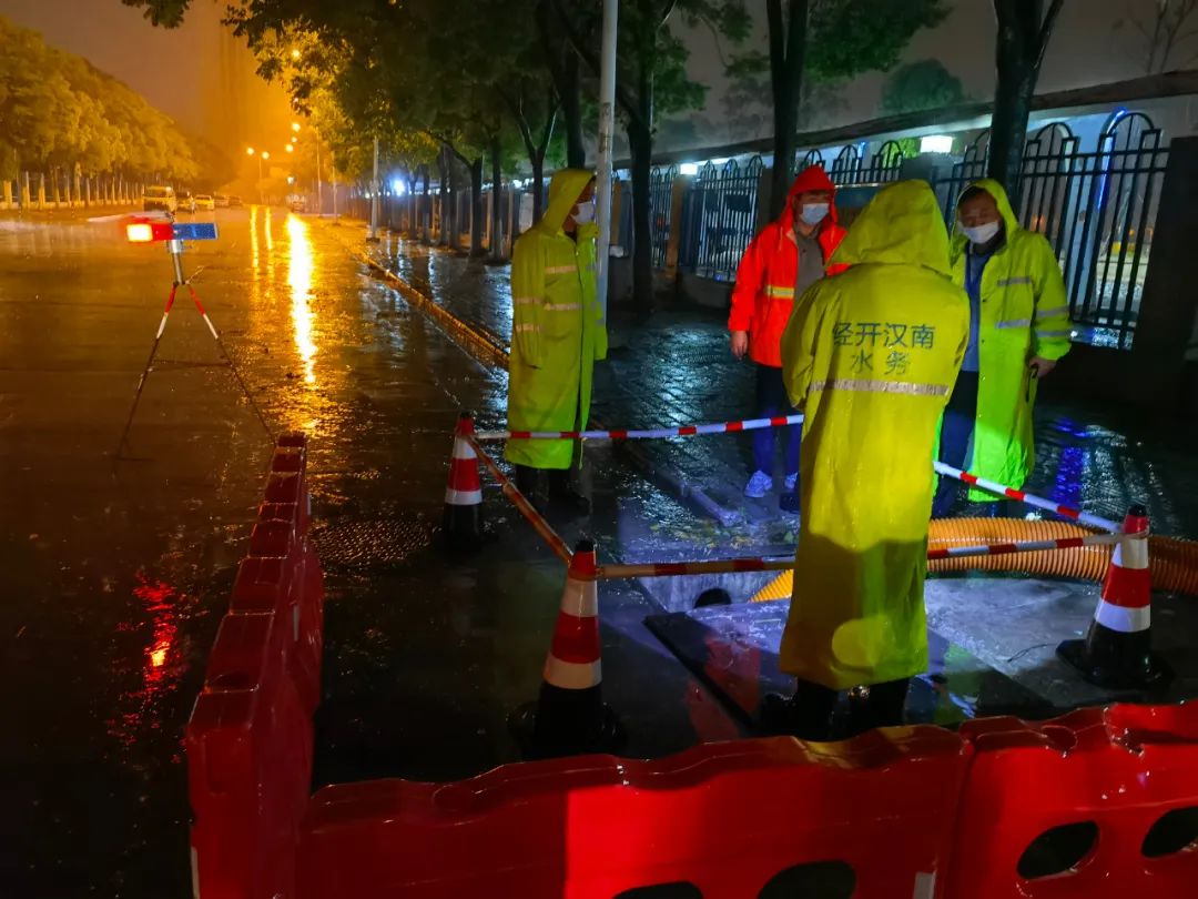 在太子湖北路、新民南路、东风中路等点位,区水务和湖泊局组建的5支50人防汛排涝应急小分队,当天下午5点左右便赶往现场值守。他们准备了抽排量每小时3000立方的“龙吸水”、移动泵车、工具车等设备。
