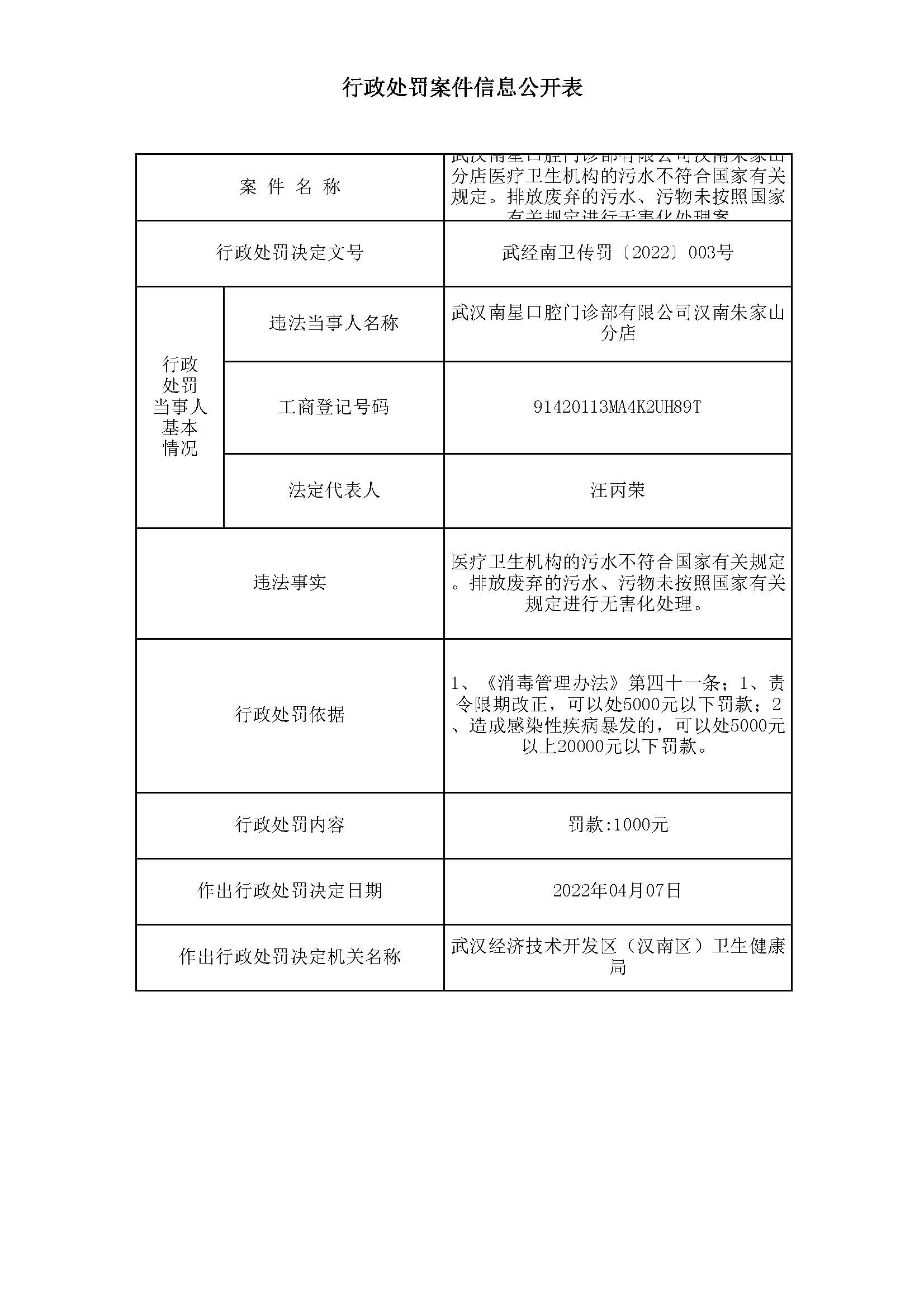 行政处罚案件华体会平台(中国)公开表(武汉南星口腔门诊部有限公司汉南朱家山分店)