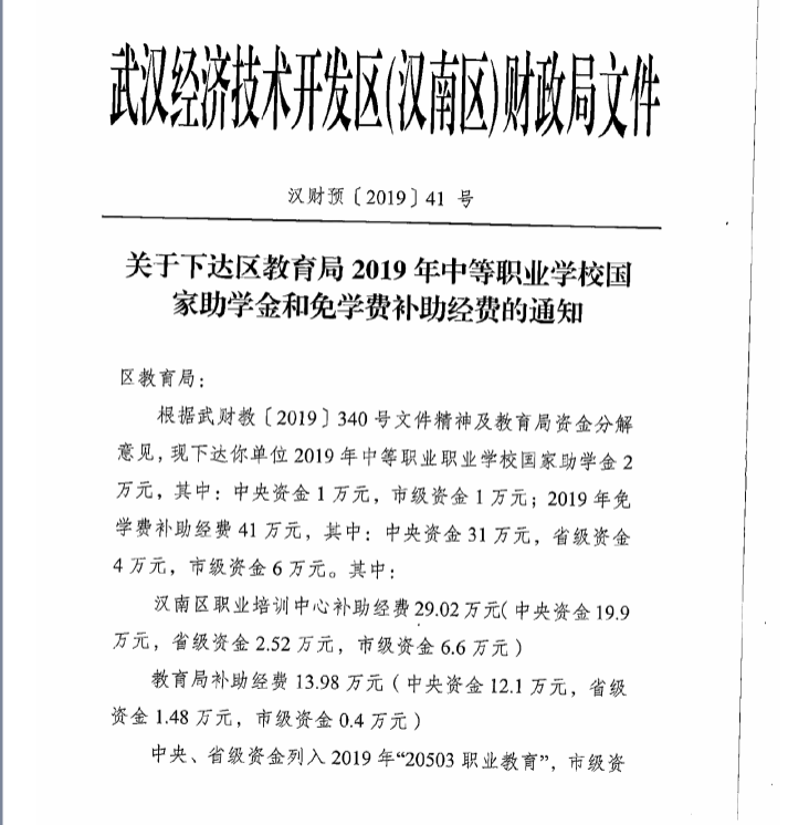 关于下达区教育局2019年中等职业学校国家助学金和免学费补助经费