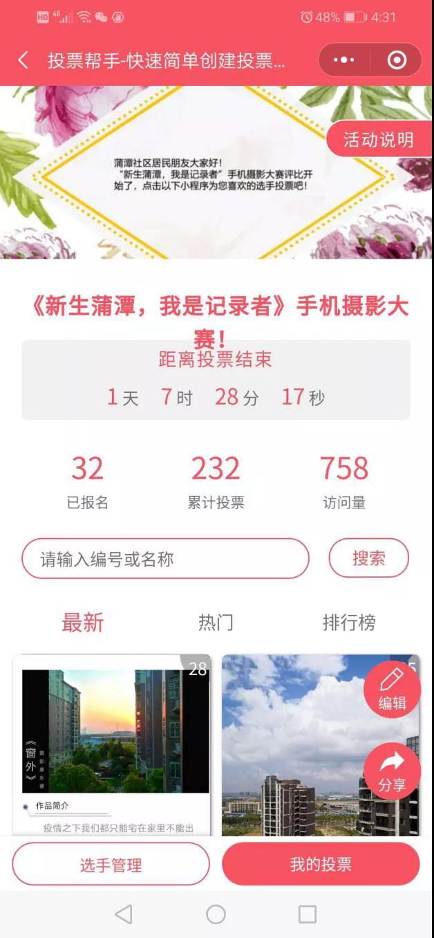 为了丰富宅家期间社区居民的文化生活、提高社区居民的审美能力和创作能力,营造积极乐观、文明向上的社区氛围,蒲潭社区居委会于4月13日-4月16日开展了宅家抗疫情活动第三弹--“新生蒲潭,我是记录者”手机摄影大赛活动。