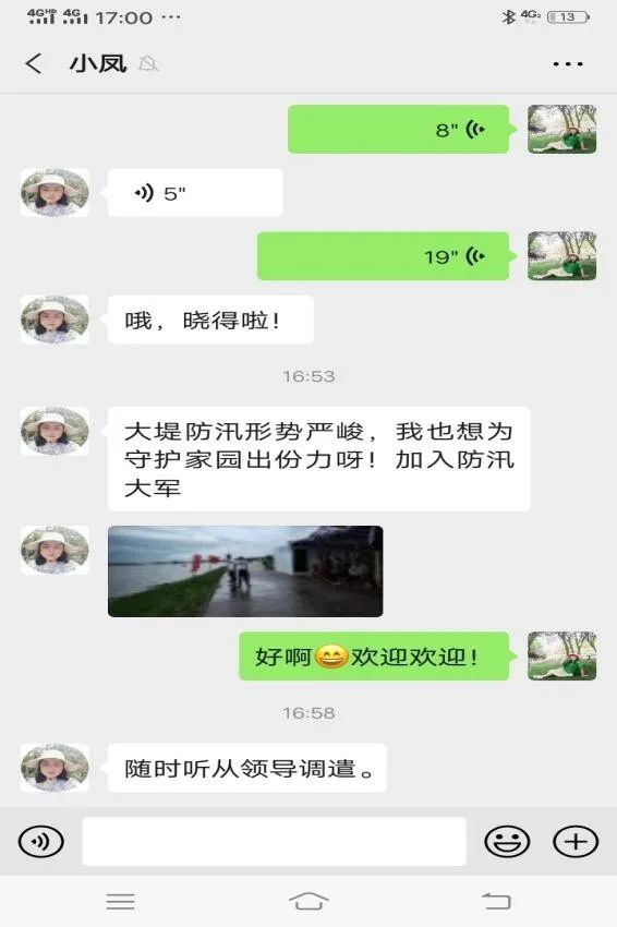 捞子湖村的“娘子军”成员熊玲利同时也是捞子湖村妇联主席,她介绍道:“我们村里的‘娘子军们’都很积极,在我们村有个妇女微信群,每天她们都关注着防汛消息,并且都自愿到村委会来报名参加防汛。其中李金凤在外打工,老公日夜在堤上防汛,她听说家乡的防汛形势严峻,毅然跟单位请假回家,赶回来报名加入到“娘子军”参与防汛。还有谢先凤等人利用周末假期自动请愿上堤排查,主动要求换上夜班,说自己年轻,熬的住;她们每天六点就上堤,晚上十点才回家,有的还要值通宵,从没一个人迟到,也没有一个人叫苦。还有几位巾帼志愿队里的成员,都在外打工,也要回来做志愿者,她们人虽在外却心系家乡。”