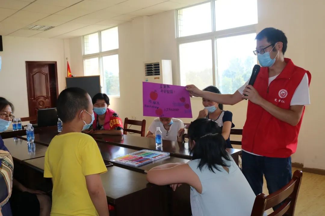 接下来的环节中,社工引导孩子们进行朋辈合作,完成共同的团队任务。“给自己的小组取一个大家都爱吃的水果名、画出水果的形状、为自己的团队起一个响亮的口号、把每个组员的名字写出来”,任务明确后,各组成员开动脑筋,互相交流,明确分工,在规定的十分钟时间里都完成了自己的目标任务。分享成果的环节,让大家感受到了团队合作的意义。