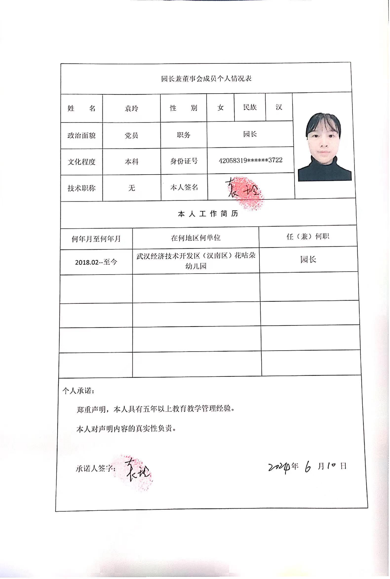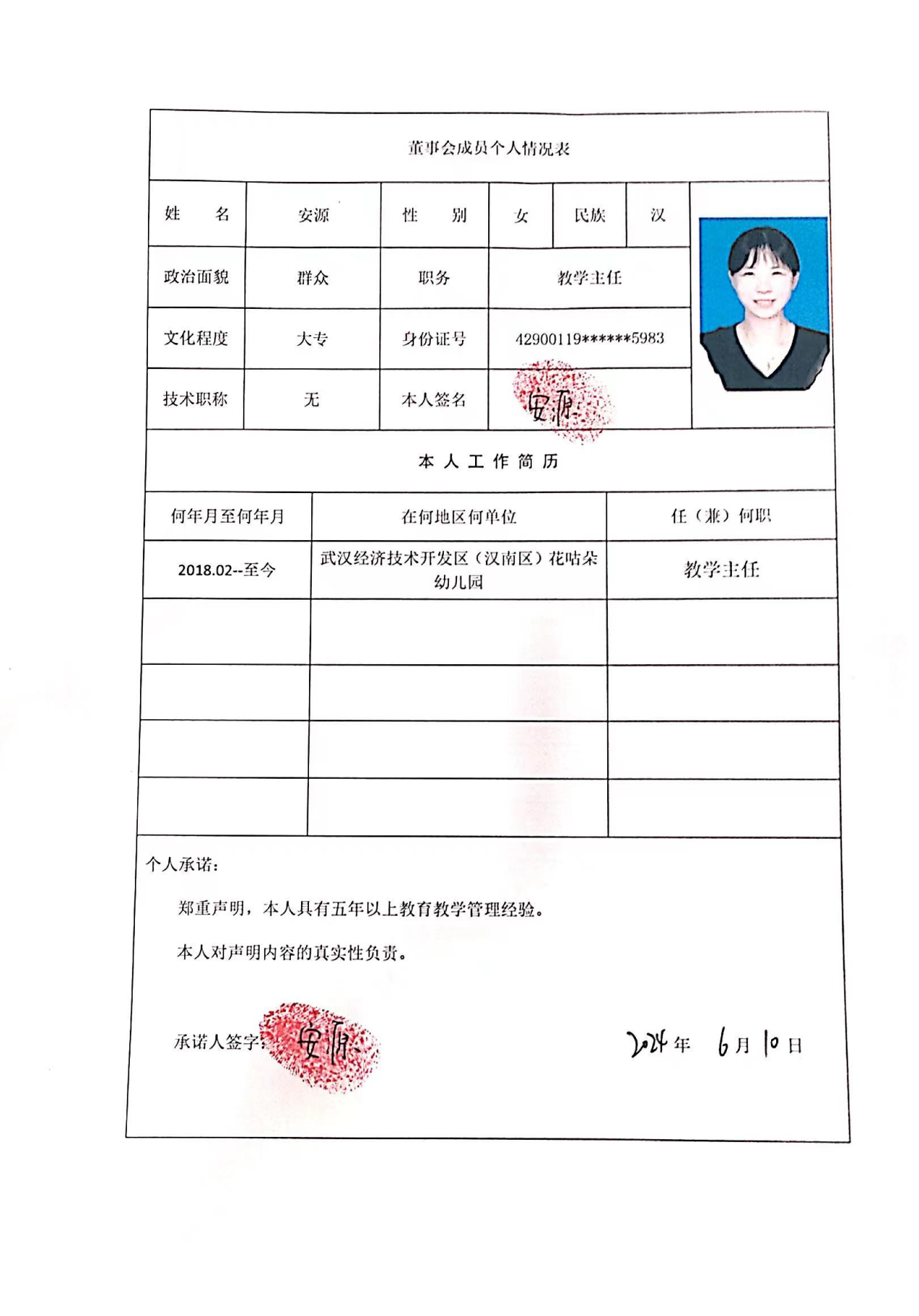 根据《中华人民共和国民办教育促进法》第二十一条之规定:学校理事会或者董事会由举办者或者其代表、校长、教职工代表等人员组成。其中三分之一以上的理事或者董事应当具有五年以上教育教学经验。因武汉经济技术开发区(汉南区)花咕朵幼儿园需办理《中华人民共和国办学许可证》,现将董(理)事会成员安源(身份证号:42122219******1224)、董(理)事会成员兼校长袁玲(身份证号:42058319******3722)的个人教育教学经验简历进行公示。