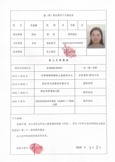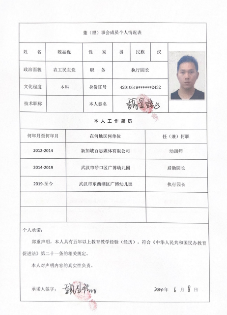 根据《中华人民共和国民办教育促进法》第二十一条之规定:学校理事会或者董事会由举办者或者其代表、校长、教职工代表等人员组成。其中三分之一以上的理事或者董事应当具有五年以上教育教学经验。因武汉经济技术开发(汉南区)广博幼儿园(筹)需办理《中华人民共和国办学许可证》,现将董(理)事会成员朱逸薇(身份证号:42070419******0608)、董(理)事会成员兼校长魏显巍(身份证号:42010619******2432)的个人教育教学经验简历进行公示。