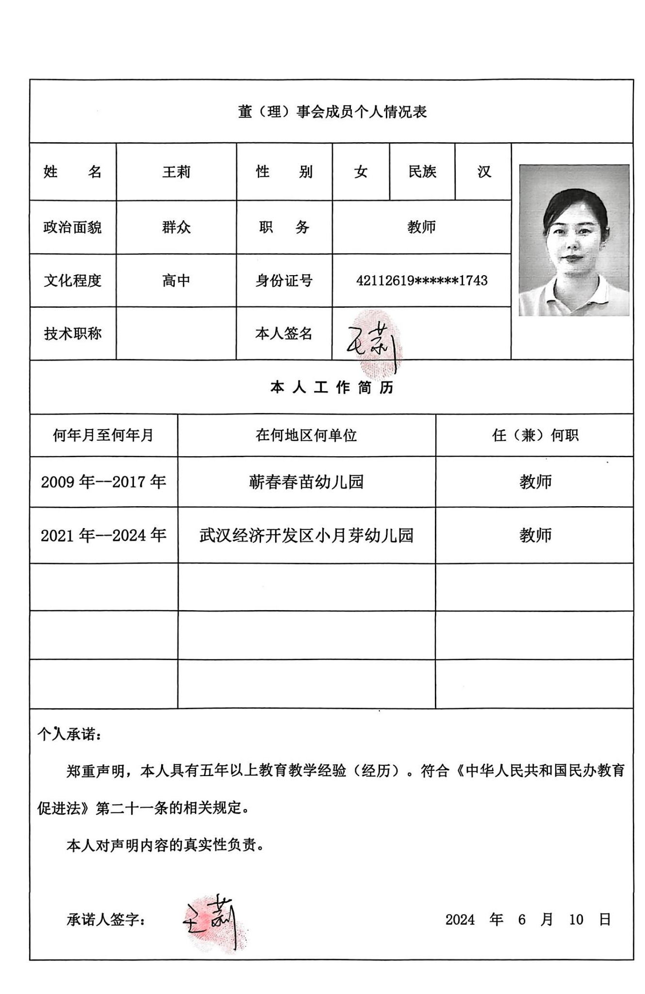 根据《中华人民共和国民办教育促进法》第二十一条之规定:学校理事会或者董事会由举办者或者其代表、校长、教职工代表等人员组成。其中三分之一以上的理事或者董事应当具有五年以上教育教学经验。因武汉经济技术开发区(汉南区)小月芽幼儿园(筹)需办理《中华人民共和国办学许可证》,现将董(理)事会成员王莉(身份证号:42112619******1743)、董(理)事会成员兼校长王玮聪(身份证号:42012319******5941)的个人教育教学经验简历进行公示。