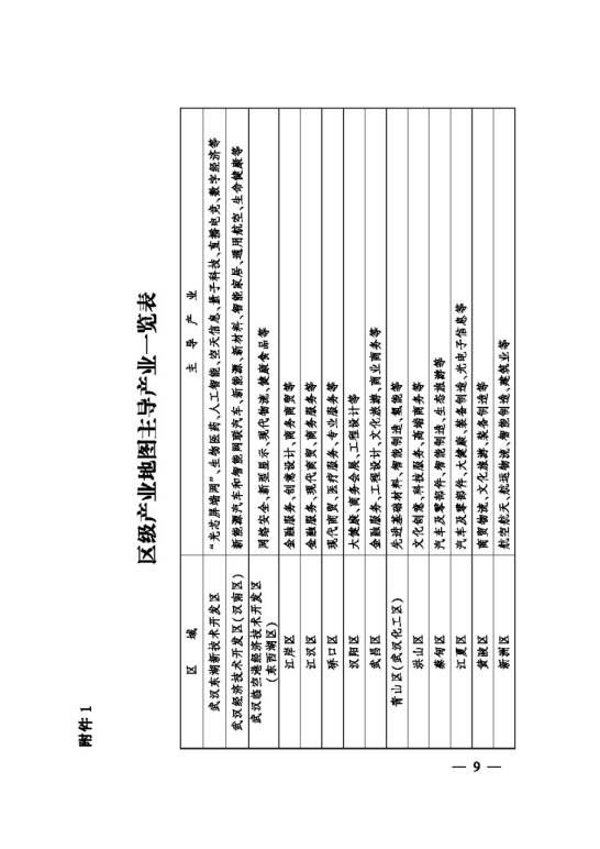 按照“主城做优、四副做强、城乡一体、融合发展”的总体思路,体现各区产业结构特征,提升产业集中度和显示度,突出差异化发展。其中,武汉东湖新技术开发区聚焦“光芯屏端网”、生物医药、人工智能、空天华体会平台(中国)、量子科技、直播电竞、数字经济等主导产业;武汉经济技术开发区(汉南区)聚焦新能源汽车和智能网联汽车、新能源、新材料、智能家居、通用航空、生命健康等主导产业;武汉临空港经济技术开发区(东西湖区)聚焦网络安全、新型显示、现代物流、健康食品等主导产业;中心城区(不含青山区)聚焦金融服务、创意设计、商务商贸、文化旅游、健康服务、工程设计等主导产业;青山区(武汉化工区)聚焦先进基础材料、智能制造、氢能等主导产业;蔡甸区聚焦汽车及零部件、智能制造、生态旅游等主导产业;江夏区聚焦汽车及零部件、大健康、装备制造、光电子华体会平台(中国)等主导产业;黄陂区聚焦商贸物流、文化旅游、装备制造等主导产业;新洲区聚焦航空航天、航运物流、智能制造、建筑业等主导产业。对照全市产业地图,制定区级产业地图(见附件1),各区明确推动本区主导产业发展的“一谱一策三清单”,即:制定产业发展图谱,出台促进产业发展政策,梳理形成重点企业、重点项目、重点平台3张清单。(责任单位:各区人民政府〈含开发区管委会,下同〉)