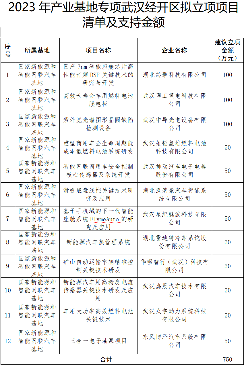 近日,武汉市科技局公示2023年度产业基地科技创新专项拟立项项目,全市五大产业基地共36个科技创新专项获批,其中武汉经开区国家新能源和智能网联汽车基地拟立项12项,为五大基地数量最多。