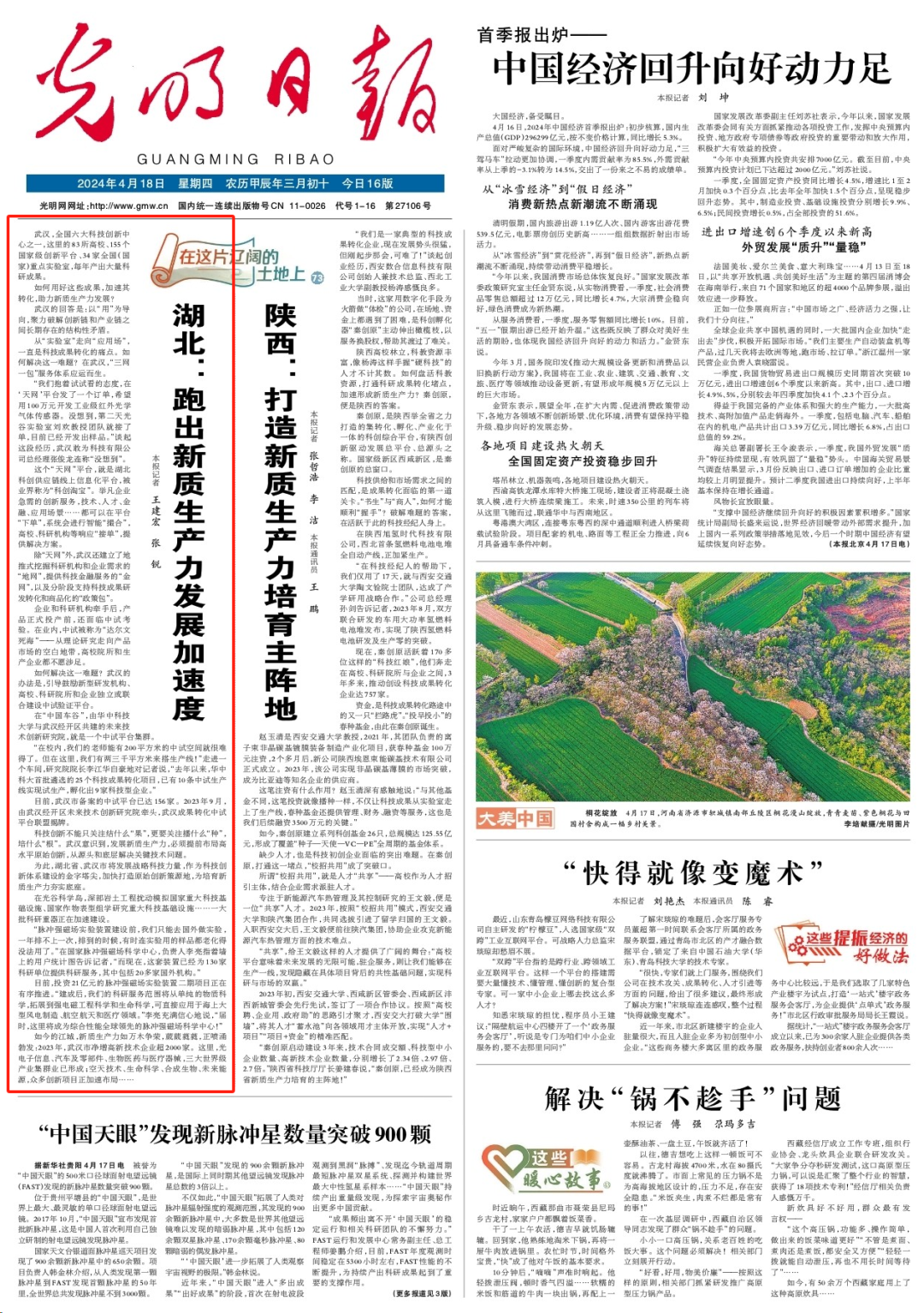 4月18日,《光明日报》头版刊发文章《湖北:跑出新质生产力发展加速度》,报道了湖北省以科技创新为抓手,积极培育和发展新质生产力的先进经验。其中,重点报道了武汉经开区引导鼓励新型研发机构、高校、科研院所和企业独立或联合建设中试验证平台,与华中科技大学共建未来技术创新研究院,加快推动科技成果转化,助力新质生产力发展的创新实践。