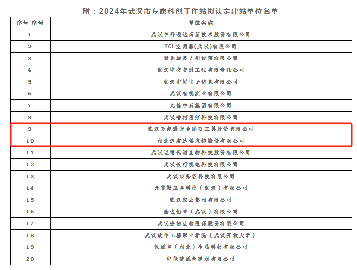 近日,2024年武汉市专家科创工作站拟认定建站单位名单公布,武汉万邦激光金刚石工具股份有限公司(以下简称“武汉万邦激光”)、湖北迈睿达供应链股份有限公司(以下简称“湖北迈睿达”)等2家武汉经开区企业名列其中。这是继天源环保建成专家科创工作站后,武汉经开区企业再度新建专家科创工作站。至此,全区专家科创工作站已达3家。