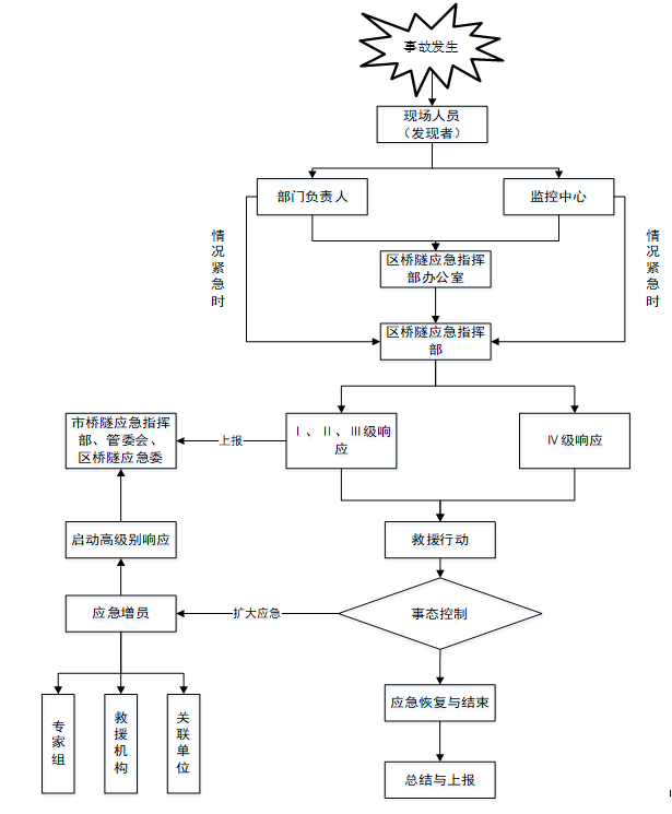 发生城市桥隧设施事故,各桥隧管养责任单位应立即实施先期处置,组织营救受伤人员,疏散、撤离现场受到威胁的人员及车辆,标明、警戒危险区域,可直接采取临时封闭城市桥隧的管制措施和其他防止危害扩大的必要措施,在区交通大队、区消防大队、区卫健局等单位开展专业抢险救援时,积极协助做好相关工作。