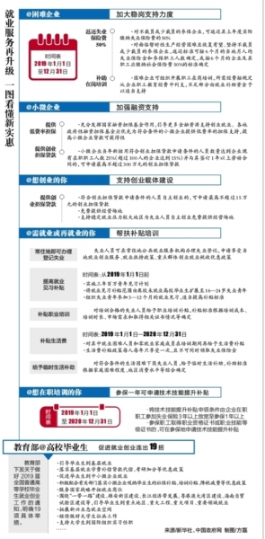 《意见》提出了当前和今后一个时期促进就业的重点举措。一是支持企业稳定发展。对不裁员或少裁员的参保企业,可返还其上年度实际缴纳失业保险费的50%,对其中面临暂时性生产经营困难且恢复有望的,加大返还力度。充分发挥国家融资担保基金作用,鼓励各地优先为符合条件的小微企业提供低费率的担保支持,提高小微企业贷款可获得性。二是鼓励支持就业创业。加大创业担保贷款支持力度,符合条件的个人和小微企业,可分别申请最高不超过15万元和300万元的创业担保贷款。鼓励各地加快建设重点群体创业孵化载体,支持就业压力较大地区为失业人员自主创业免费提供经营场地。实施三年百万青年见习计划,将就业见习补贴范围扩展至16-24岁失业青年。三是积极实施培训。困难企业可组织开展职工在岗培训,企业职工教育经费不足部分,经所在地人社部门审核评估合格后,由就业补助资金予以适当支持。对下岗失业人员普遍开展有政府补贴的培训,对其中符合条件的就业困难人员和零就业家庭成员在培训期间再给予生活费补贴。将技术技能提升补贴申领条件由企业在职职工参加失业保险3年以上调整至参保1年以上。四是及时开展下岗失业人员帮扶。失业人员可在常住地办理失业登记,申请享受当地就业创业服务、就业扶持政策、重点群体创业就业税收优惠政策。对符合条件的下岗失业人员,及时落实失业保险待遇,并纳入最低生活保障和临时救助范围。